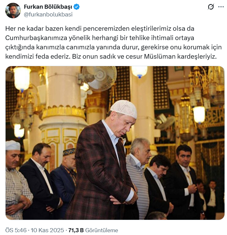 Bölükbaşı, yeni paylaşımında Erdoğan’ın namaz kıldığı bir fotoğrafı paylaşarak, “Her ne kadar bazen kendi penceremizden eleştirilerimiz olsa da Cumhurbaşkanımıza yönelik herhangi bir tehlike ihtimali ortaya çıktığında kanımızla canımızla yanında durur, gerekirse onu korumak için kendimizi feda ederiz. Biz onun sadık ve cesur Müslüman kardeşleriyiz” ifadelerini kullandı.